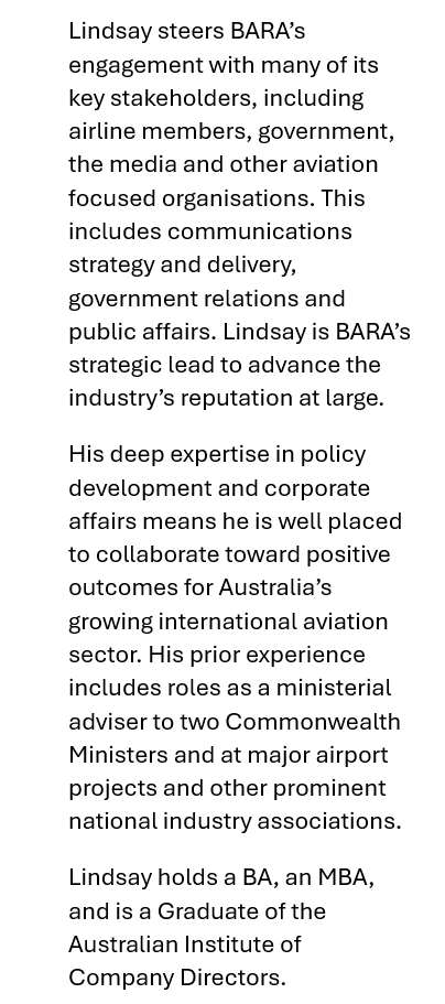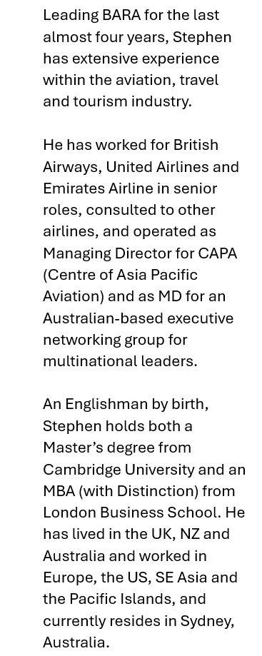 The Board of Airline Representatives of Australia (BARA) is the industry body that promotes the safe and efficient operations of international airlines serving Australia for the benefit of consumers, businesses and tourism. BARA’s member airlines provide over two thirds of all international passenger flights to and from Australia.